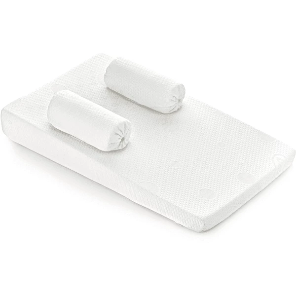 Daarnaast heeft het kussen twee kleinere wigkussens die aan de linker- en rechterkant van het kind kunnen worden aangebracht. Ze houden de baby in een zijdelingse positie door de rug en de buik te ondersteunen. Volgens de wetenschap kan een zijwaartse ligging ook terugvloeiing en braken in het algemeen tegengaan. Bovendien is de zijdelingse positie geschikt voor baby’s om vervorming of vervlakking van de achterkant van het hoofd te voorkomen.