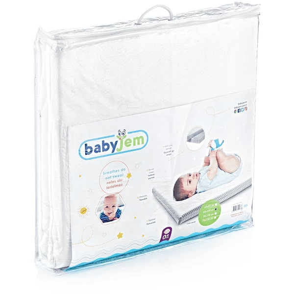 Zoals alle BabyJem-textiel is ook de witte, ademende matrashoes specifiek getest op schadelijke stoffen. Het gestructureerde oppervlak voert vocht, overtollige warmte en ademlucht snel af. Uiteraard is de hoes afneembaar en wasbaar vanaf 30°C.