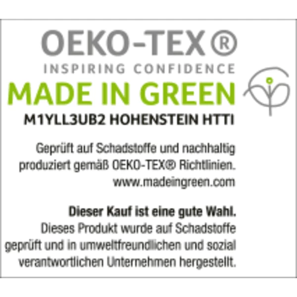 - Gecertificeerd volgens STANDAARD 100 door OEKO-TEX®: 97.T.1067 HOHENSTEIN HTTI