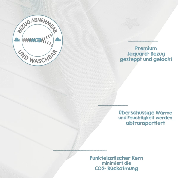 roba Het wiegmatras AIR BALANCE PLUS safe asleep®, met ademend 3D-materiaal, zorgt voor een optimaal slaapklimaat voor uw baby. Een puntelastisch en luchtcirculerend wiegmatras draagt bij tot de veiligheid in het babybed. Omdat baby’s zachte botten hebben, mag de matras niet te hard zijn. De safe asleep® matrassen zijn net stevig genoeg, zodat er geen holtes ontstaan waarin uw kind te diep kan wegzakken. Alle safe asleep® matrassen zijn uitgerust met het AIR- balance systeem, dat werkt als een natuurlijk airconditioningsysteem. Verticaal ontworpen groeven en gaten in het wiegmatras minimaliseren de CO2-rebreathing en voeren overtollige warmte en vocht af, waardoor ongezonde warmteontwikkeling wordt voorkomen. De matras is gemaakt van ademend materiaal met 3D-structuur, wat zorgt voor een optimale luchtcirculatie en een gezond, comfortabel klimaat waarin uw baby vrij kan ademen en niet zweet. De afneembare, gewatteerde en geperforeerde jacquard hoes is wasbaar op 30° C en geschikt voor de droogtrommel. De safe asleep® matrassen werden ontwikkeld in samenwerking met artsen en vroedvrouwen en zijn ook zeer geschikt voor mensen met een allergie. Alle safe asleep® matrassen zijn ontwikkeld volgens de huidige DIN EN 16890 norm en zijn getest op schadelijke stoffen volgens Ă–ko-Tex® Standard 100 en LGA.