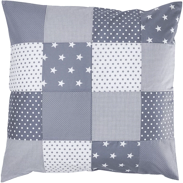 De achterkant van het kussensloop is unikleurig, terwijl de voorkant bestaat uit 16 verschillende patches. De losse patches zijn met de hand aan elkaar genaaid.